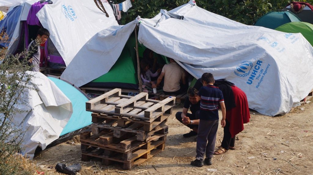 Πάνω σε παλέτες στήνουν την μικρή σκηνή που τους δίνουν κατά την ώρα υποδοχής, όπως είδαμε, και προσπαθούν να καταλάβουν πώς θα επιβιώσουν..