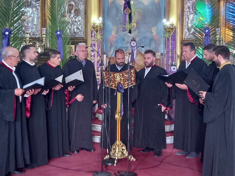 Υπό τη διεύθυνση του χοράρχη τους κ. Βασιλείου Χαμέτη απέδωσαν κατά το επιβεβλημένο βυζαντινό ύφος την πλούσια υμνολογία της εκκλησίας μας, ενώ εντυπωσιακές ήταν και οι μονωδίες των επιφανών Ιεροψαλτών. Η χορωδία έκλεισε με το τροπάριο της Κασσιανής «Κύριε η εν πολλαίς αμαρτίαις…» σε μέλος του Κων/νου Πρίγγου.