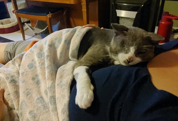 Μόλις ήταν ιατρικά εντάξει, η Colleen Drury, μια άλλη εθελόντρια, τον πήρε στο σπίτι για να τον κοινωνικοποιήσει. “Έπρεπε να περάσει λίγο χρόνο με άλλες γάτες και να νιώσει ακόμα πιο άνετα να ζει σε εσωτερικούς χώρους”, δήλωσε ο Chris.
