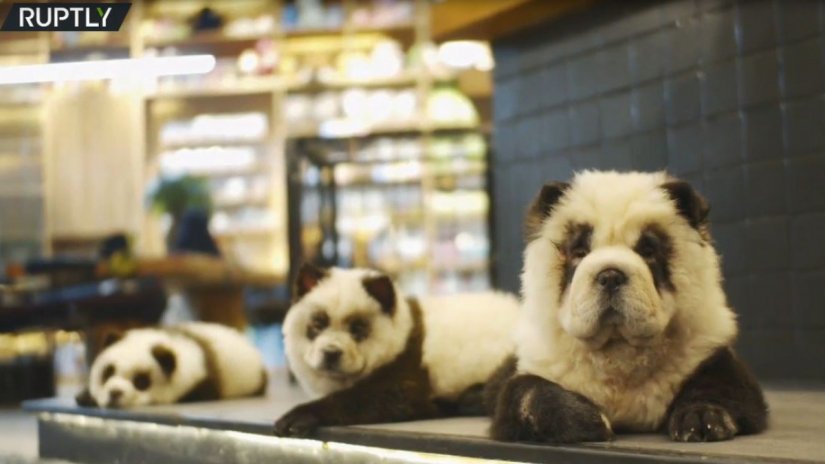 Oι ιδιοκτήτες μιας καφετέριας στην πόλη Τσένγκντου στην Κίνα έχουν βάψει έξι σκυλιά ράτσας Τσόου-Τσόου ασπρόμαυρα για να μοιάζουν με Πάντα, προκειμένου να προσελκύσουν πελάτες.
