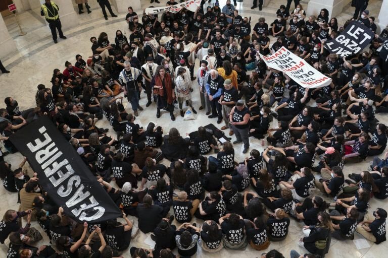 Συγκέντρωση έξω από το κτίριο του Κογκρέσου στην Ουάσινγκτον των ΗΠΑ, αλλά και μέσα σε αυτό, πραγματοποιούν Αμερικανοεβραίοι, καλώντας το νομοθετικό σώμα να ζητήσει κατάπαυση πυρός στη Λωρίδα της Γάζας.