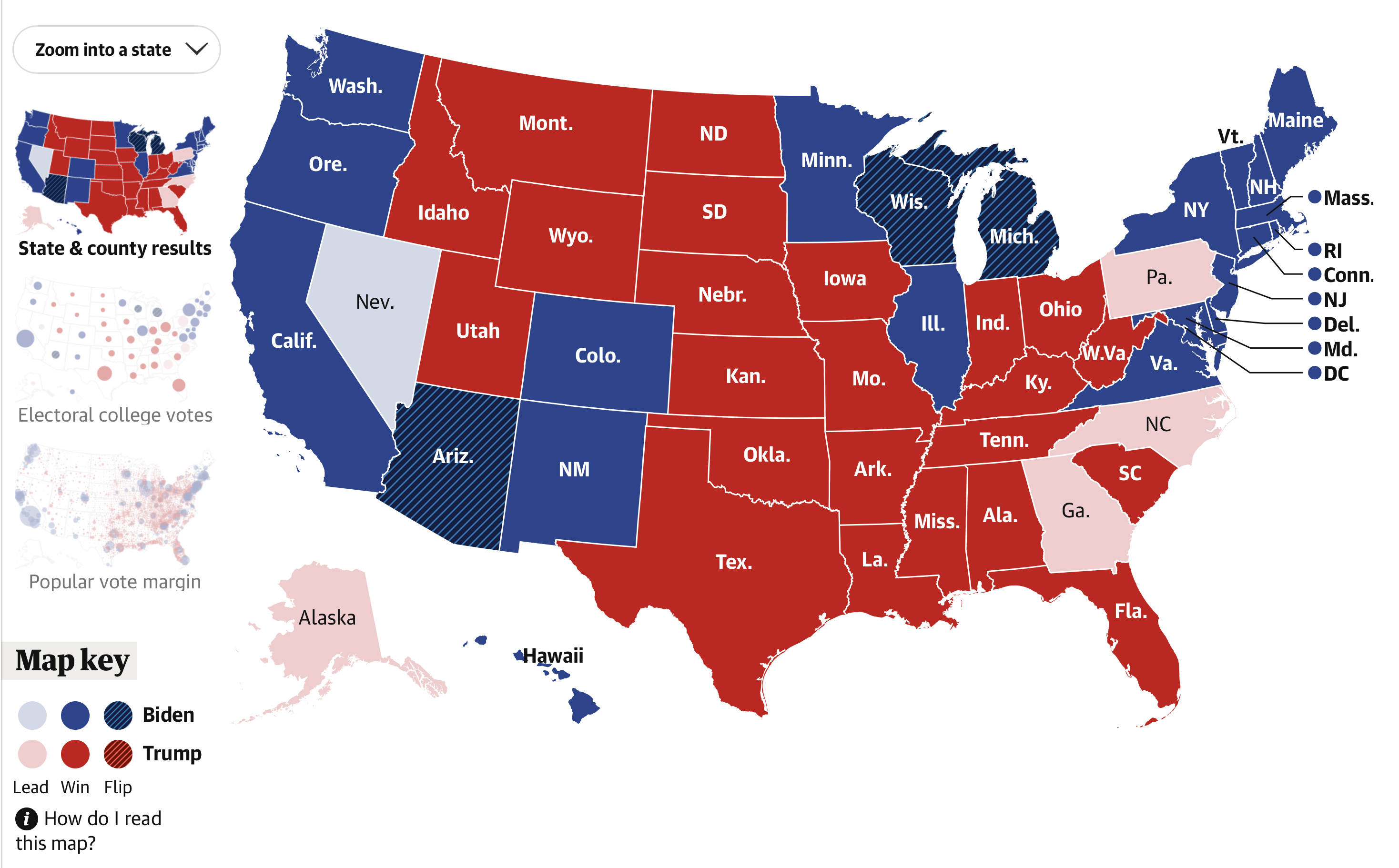 Καθώς η καταμέτρηση των ψηφοδελτίων συνεχίζεται, ο Τραμπ μένει πίσω με 214 εκλέκτορες ωστόσο σε τρεις από τις τέσσερις πολιτείες «κλειδιά» προηγείται στην καταμέτρηση ενώ σε μία ακόμα, τη Νεβάδα, η μάχη θεωρείται οριακή, ο Μπάιντεν διατηρεί πολύ μικρό προβάδισμα.