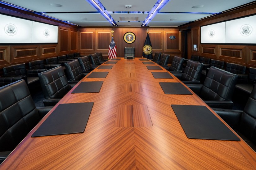 «Οι αναβαθμίσεις είναι αναγκαίες για να μένεις ασφαλής από εξωτερικούς εχθρούς», λέει ο Μαρκ Γκάσταφσον, επικεφαλής της αίθουσας επιχειρήσεων του Λευκού Οίκου. Στον τοίχο της αίθουσας, πράσινοι δείκτες με τις λέξεις «μη διαβαθμισμένο» και «μικρόφωνα κλειστά» δείχνουν ότι το δωμάτιο δεν παρακολουθείται τη στιγμή εκείνη από τις κάμερες ασφαλείας του Λευκού Οίκου. Παγκόσμιο ρολόι δείχνει την ώρα σε πόλεις όπως η Τεχεράνη και το Κίεβο, αλλά και στην τοποθεσία όπου βρίσκεται εκείνη τη στιγμή ο πρόεδρος, επιτρέποντας τον άμεσο συντονισμό του με την ομάδα της αίθουσας επιχειρήσεων.