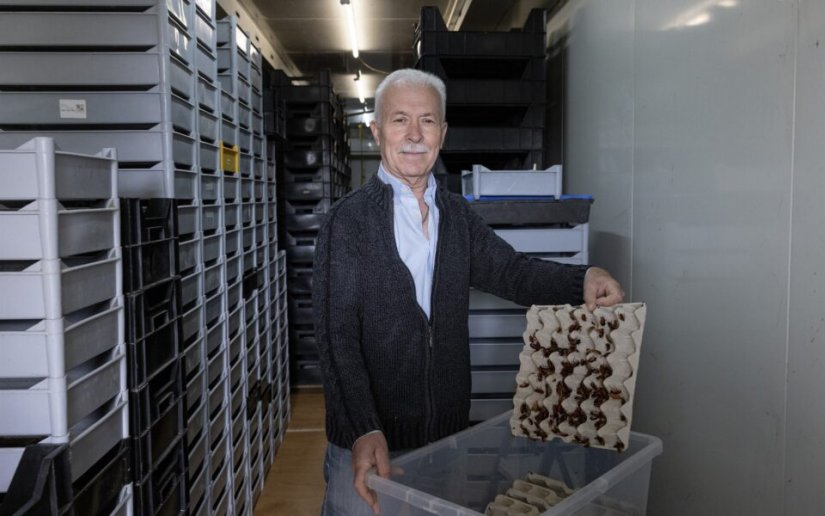 «Να σας δώσω γάντια για να τα πιάσετε;». Σπάνια λέω «όχι» σε μια ευκαιρία βιωματικού ρεπορτάζ, ωστόσο εκείνη τη στιγμή δίστασα να αγγίξω τα δεκάδες σκουλήκια που κινούνταν ασταμάτητα, δημιουργώντας μιαν αίσθηση κινούμενης άμμου μέσα στο τελάρο που είχα μπροστά μου. Αντίθετα, ο Περικλής Σταυρακάρας τα έπιασε με περισσή άνεση και τοποθέτησε ένα στην παλάμη του για να μου το δείξει. Το ίδιο έκανε και με τις καφέ κατσαρίδες που έτρεχαν πάνω-κάτω μέσα στις χάρτινες αυγοθήκες. Θα επιδείκνυε ακριβώς την ίδια άνεση αν ανακάτευε με το χέρι του σιτάρι ή σπόρους. «Είμαστε πλήρως εξοικειωμένοι», παραδέχεται.