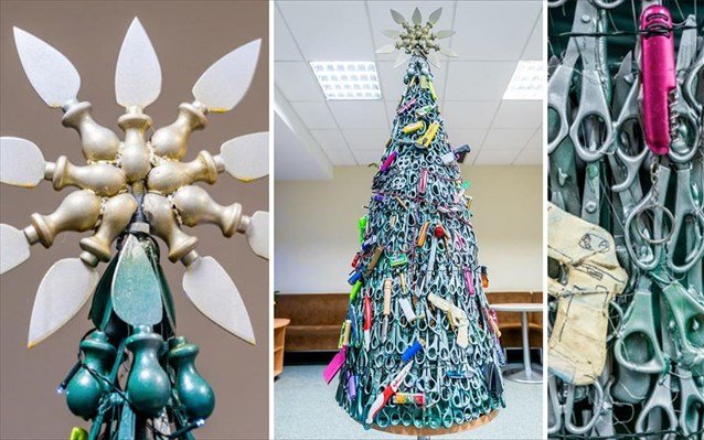 Φωτογραφίες δείχνουν το ιδιότυπο αριστούργημα, που έχει και εκπαιδευτικό σκοπό, το οποίο δεν είναι στολισμένο με χριστουγεννιάτικες μπάλες, αλλά με ψαλίδια, μαχαίρια, χαρτοκόπτες, αναπτήρες και άλλα αντικείμενα που θεωρούνται επικίνδυνα και δεν επιτρέπεται να μεταφέρονται στις αποσκευές σε αεροπορικές πτήσεις.