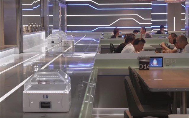 Ρομπότ χρησιμοποιεί αντί για ανθρώπους σερβιτόρους εστιατόριο στη Σαγκάη της Κίνας, στο πλαίσιο μιας πρωτοβουλίας του κινεζικού κολοσσού του e-commerce, Alibaba.