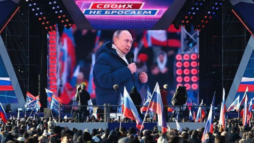Φορώντας μπουφάν και λευκό ζιβάγκο, ο Ρώσος πρόεδρος ανέβηκε στη σκηνή του σταδίου Λουζνίκι, όπου γιορτάστηκε η προσάρτηση της Κριμαίας.