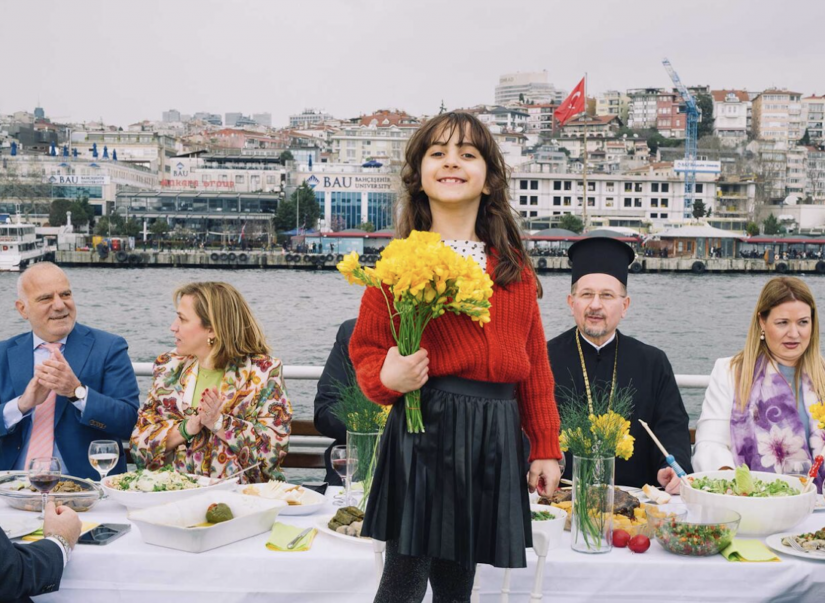Στημένο στο κατάστρωμα του βαποριού πλάι στην κουπαστή, στολισμένο με λευκά τραπεζομάντιλα και ανοιξιάτικες πασχαλιές και φρέζιες, το τραπέζι μας άρχισε να υποδέχεται τους καλεσμένους μας: πρώτα πρώτα τον Έλληνα γενικό πρόξενο στην Κωνσταντινούπολη, πρέσβη Κωνσταντίνο Κούτρα, με την εκπαιδευτικό σύζυγό του Ποπίτα Παύλη. Τους ακολούθησαν, μεταξύ άλλων, ο διευθυντής του Ζωγραφείου Λυκείου, Γιάννης Δεμιρτζόγλου, ο μητροπολίτης Κυδωνιών κ. Αθηναγόρας, η πρόεδρος της κοινότητας του Μεγάλου Ρεύματος, Ντόρα Διακρούση, και ένα πλήθος από μέλη της, άνδρες και γυναίκες, που κατέφθασαν με αμέτρητες πιατέλες, σαλατιέρες και δίσκους, φορτωμένα με ό,τι καλύτερο έχει να αναδείξει η γιορταστική, εαρινή πολίτικη κουζίνα: τις λαδερές γεμιστές πιπεριές και τους ντολμάδες, που θα πήραν ώρες να τυλιχτούν, τις αφράτες ταραμοσαλάτες, τα τζιγέρια στο τηγάνι, τα μικροσκοπικά τρίγωνα μπουρεκάκια με τυρί, τις καταπράσινες ανοιξιάτικες σαλάτες, τις κάθε λογής και σύνθεσης αλοιφές, τους παστουρμάδες, τα σουτζούκια και τα πιπεράτα κασέρια. Όλοι τους ετοίμαζαν για μέρες αυτά τα εδέσματα, τα στόλισαν με χάρη, μεράκι και φροντίδα περισσή, όπως αρμόζει σε πιάτα πολίτικα, άνθρωποι που καλύτερα από όλους ξέρουν πως η απόλαυση πρώτα περνά από τα μάτια και έπειτα από το στομάχι.