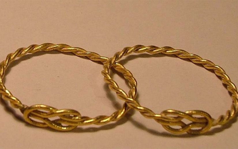 - Χρυσό δαχτυλίδι με ραβδωτό σκαραβοειδή αχάτη στην αρθρωτή στεφάνη. Φέρει εγχάρακτη διακόσμηση με δύο πολεμιστές. 2ος αι. π.Χ.