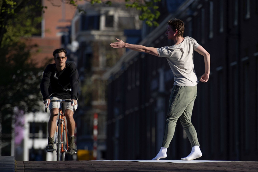 Έξι χορευτές από το Εθνικό Μπαλέτο της Ολλανδίας βγήκαν στους άδειους δρόμους του Άμστερνταμ για να ερμηνεύσουν το δικό τους κομμάτι μιας χορογραφίας που είναι εμπνευσμένη από τον νέο κορωνοϊό.