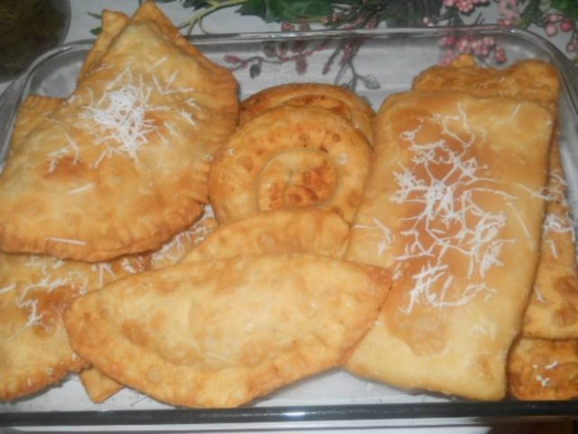 Απλώνουμε σε κάθε φύλλο λίγη γέμιση και κλείνουμε σε φάκελο. Σφραγίζουμε τις πίτες με ένα πιρούνι και τις τηγανίζουμε σε άφθονο και καυτό ελαιόλαδο μέχρι να πάρουν χρυσό χρώμα.