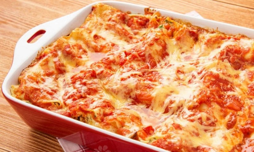 - Απλώνουμε 2-3 κουτ. σούπας ντομάτα σε ένα ταψί με διαστάσεις περίπου 25 x 30 εκ. και στρώνουμε από πάνω μία στρώση λαζάνια, σπάζοντας μερικά σε μικρότερα κομμάτια, αν χρειάζεται, για να χωρέσουν ακριβώς.