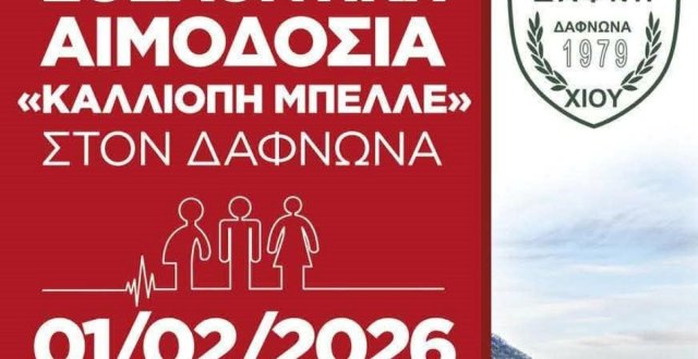 Η Νοσοκομειακή Υπηρεσία Αιμοδοσίας Χίου ενημερώνει ότι την Κυριακή 1Φεβρουαρίου από τις 9:30 π.μ. έως την 1:00 μ. θα πραγματοποιηθεί εθελοντική Αιμοδοσία "ΚΑΛΛΙΟΠΗ ΜΠΕΛΛΕ" στον Δαφνώνα με την υποστήριξη του Πολιτιστικού Μορφωτικού Συλλόγου Δάφνη Δαφνώνα και του Ποδοσφαιρικού Ομίλου "Δάφνη" στο κτίριο πολλαπλών χρήσεων του χωριού.