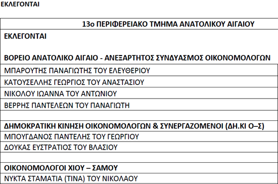 Στο Δ.Σ. του 13ου περιφερειακού τμήματος Ανατολικού Αιγαίου εκλέγονται οι:
