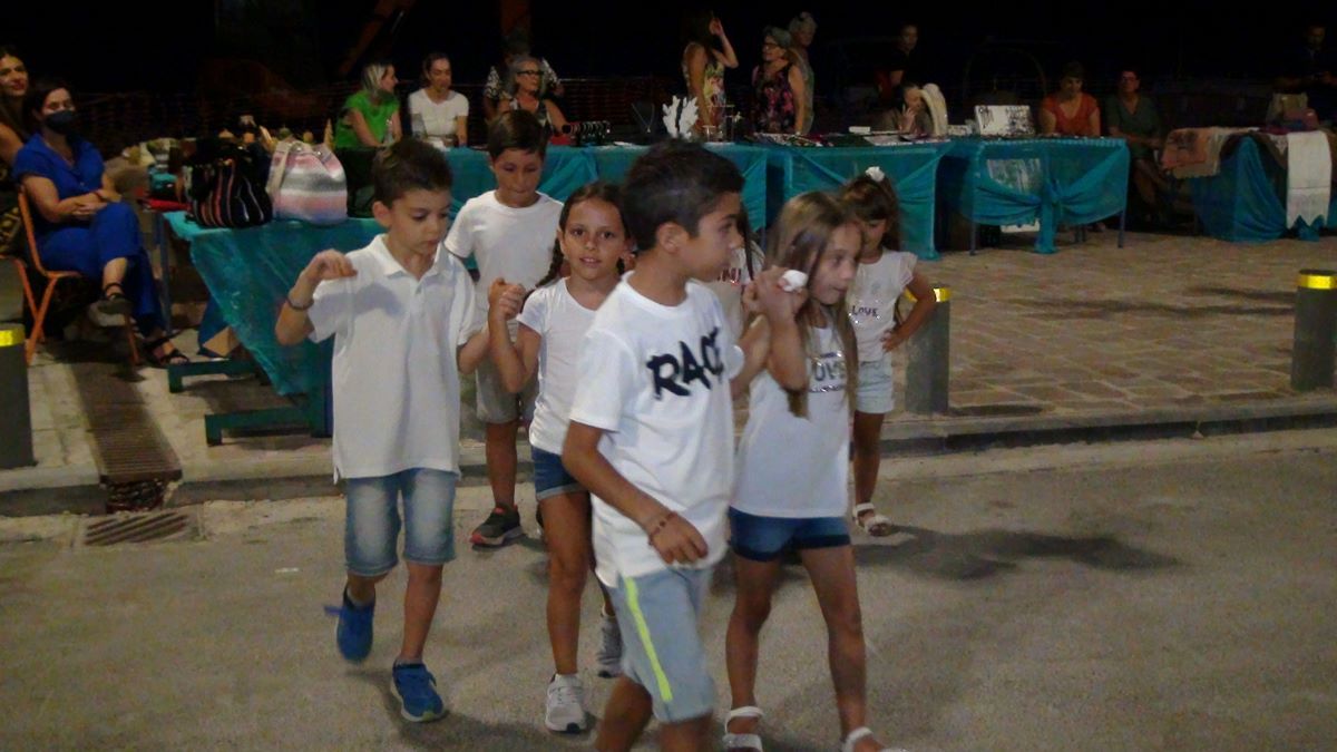 Στην έναρξη της βραδιάς και της έκθεσης στην όμορφη παραλία στο Μάρμαρο, ''υπό το βλέμμα'' του αγάλματος του Καρδαμυλίτη Ναυτικού, οι Εκθέτριες και ο κόσμος που γέμισε τα καθίσματα γύρω από το πάνελ με τα εκθέματα, απόλαυσαν το όμορφο και χαριτωμένο Παιδικό Χορευτικό Τμήμα του Φιλοπρόοδου Ομίλου Καρδαμύλων που επιμελείται με επιτυχία η Ιουλία Λιγνού.