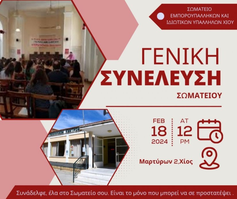 Το Διοικητικό Συμβούλιο του Σωματείου μας καλεί τα μέλη του σε Γενική Συνέλευση που θα πραγματοποιηθεί την Κυριακή 18 Φλεβάρη 2024 στο Εργατικό Κέντρο Χίου, στις 12 μ.μ.