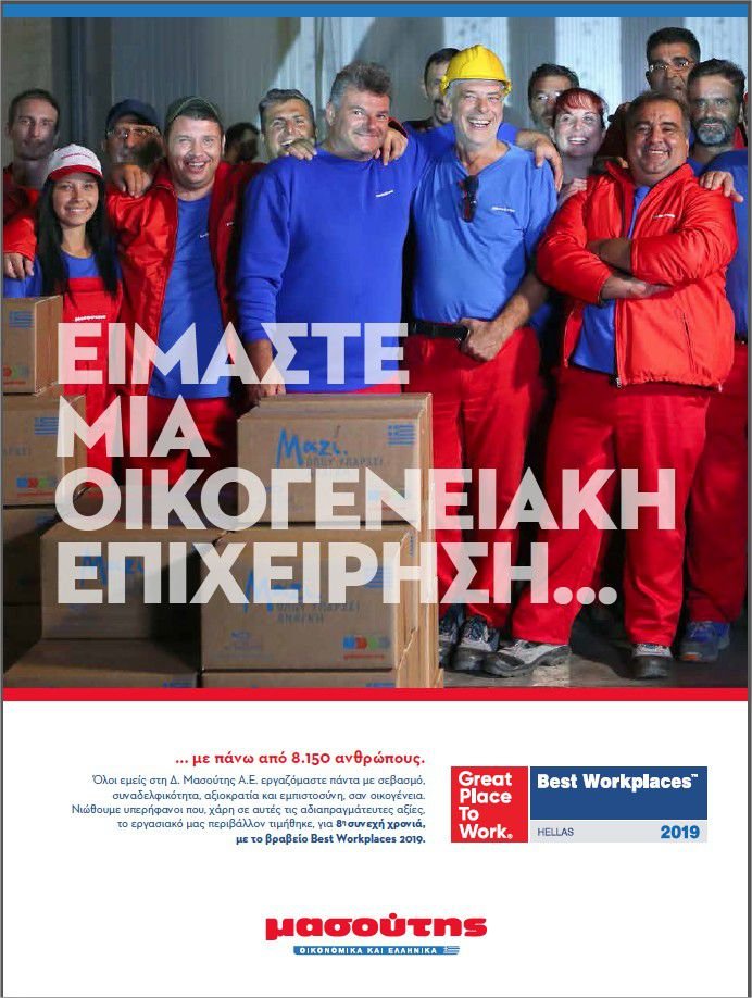Μια ακόμα χρονιά περηφάνιας για την Διαμαντής Μασούτης Α.Ε. και τους ανθρώπους της. Για 8η συνεχή χρονιά διακρίνεται μέσα στις 10 πρώτες εταιρείες με το καλύτερο εργασιακό περιβάλλον στην Ελλάδα κατακτώντας την 3η θέση. Αξιοσημείωτο είναι ότι αποτελεί και τη μόνη αλυσίδα τροφίμων – σούπερ μάρκετ - που διακρίνεται στη λίστα, αποδεικνύοντας εμπράκτως ότι προσφέρει ασφαλές και ευχάριστο περιβάλλον εργασίας στους ανθρώπους της, όπου συνεργάζονται με αλληλοσεβασμό και αγάπη για την εταιρεία, την κοινή οικογένεια.