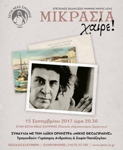 Με τη συναυλία, θα τιμηθεί ο μικρασιατικής καταγωγής Μίκης Θεοδωράκης, που στις 29 Ιουλίου συμπλήρωσε τα 92 χρόνια του - γεννήθηκε το 1925 στη Χίο. Με τη μητέρα του να έχει γεννηθεί στον Τσεσμέ -την πάλαι ποτέ Κρήνη- και τους γονείς της συζύγου του στη Σμύρνη, η περιοχή της Νέας Σμύρνης στην Αθήνα αποτέλεσε τον φυσικό προορισμό της οικογένειας και το σπίτι του Μίκη στη Νέα Σμύρνη έγινε ορμητήριο και καταφύγιο συνάμα για τον ίδιο και την οικογένειά του, κατά τα δύσκολα χρόνια ενδιάμεσα στην εξορία.