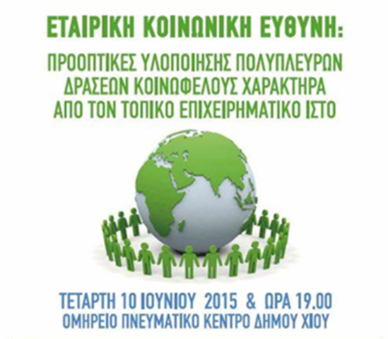 To Επιμελητήριο Χίου ως εταίρος της Αναπτυξιακής Σύμπραξης "Συν-Εργασία στη Χίο" που υλοποιεί το έργο «Δίκτυο τοπικών φορέων για την ανάπτυξη της απασχόλησης στη Χίο » πραγματοποιεί την Τετάρτη 10 Ιουνίου στις 7 μ.μ. στο Ομήρειο ημερίδα με θέμα: «Εταιρική Κοινωνική Ευθύνη: Προοπτικές υλοποίησης πολύπλευρων δράσεων κοινωφελούς χαρακτήρα από τον τοπικό επιχειρηματικό ιστό»