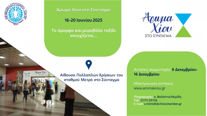 Όπως ενημερώνει το Επιμελητήριο Χίου, μέχρι τις 16 Δεκεμβρίου υποβάλλονται οι αιτήσεις συμμετοχής στη δράση «Άρωμα Χίου» που διοργανώνει κάθε χρόνο στην Αίθουσα Πολλαπλών Χρήσεων στον Σταθμό του Μετρό στο Σύνταγμα.
