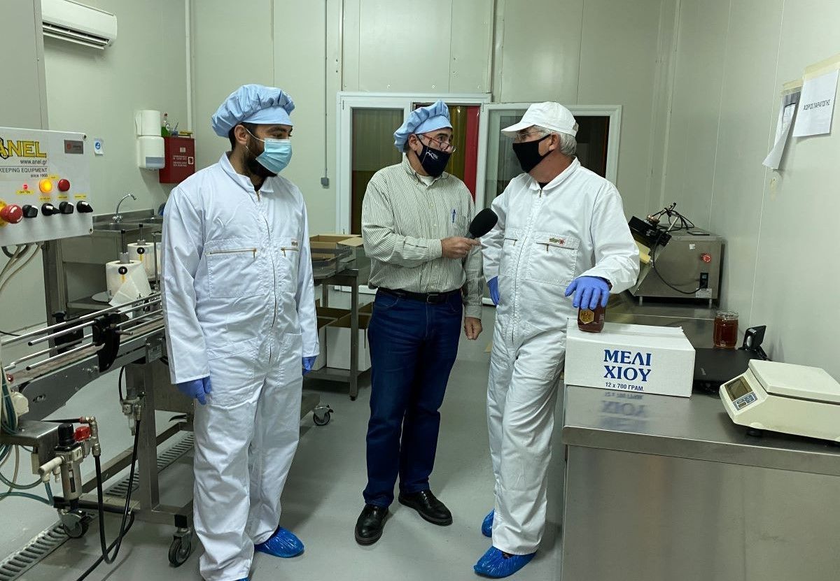 Αναφερόμαστε στον Γρηγόρη Σαμούρη, από τον οποίο ζητήσαμε ως Πρόεδρο του Αγροτικού Μελισσοκομικού Συνεταιρισμού Χίου να μας ξεναγήσει στις ιδιόκτητες εγκαταστάσεις του, στο Χαλκειός.