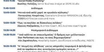 Από το πρόγραμμα δε λείπουν τα πάντα επίκαιρα θέματα των social media (Βασίλης Πολύζος - Social Media Marketing), αλλά και των πωλήσεων (Σέργιος Μαζαράκης - Πως να πουλάτε σε δύσκολους πελάτες),