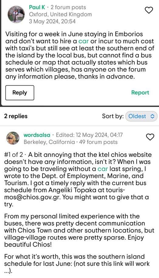 Παρακάτω μπορείτε κανείς να διαβάσει 2 ενδεικτικές κριτικές από το tripadvisor από ξένους, στην μία κριτική η τουρίστρια που σκοπεύει να έρθει τώρα τον Ιούνιο απεγνωσμένα ψάχνει στο διαδίκτυο πληροφορίες για τη δημόσια συγκοινωνία χωρίς να νοικιάσουν αυτοκίνητο ενώ στην δεύτερη κριτική η τουρίστρια είχε έρθει πέρσι και κάνει αναφορά για προβληματικό δίκτυο και καμία πληροφόρηση του υπεραστικού ΚΤΕΛ στο διαδίκτυο. Ο Σύλλογος είχε ζητήσει τέλη του περασμένου Οκτωβρίου από την εταιρεία να φτιάξει την ιστοσελίδα η οποία είχε υποσχεθεί ότι εντός Δεκεμβρίου θα την έφτιαχνε αλλά ακόμη και αυτό δεν είναι εφικτό να γίνει…".