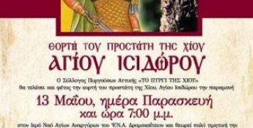 Ο Σύλλογος Πυργούσων Αττικής, τιμά την εορτή του Αγίου Ισιδώρου την Παρασκευή 15 Μαϊου στις 7.00 μ.μ. στον Ιερό ναό Αγίων Αναργύρων του Δρομοκαϊτίου...