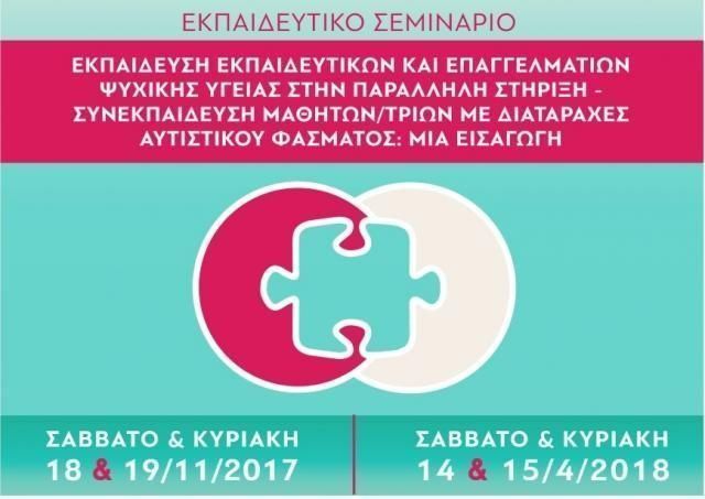 Το Τμήμα Επιστημονικής Τεκμηρίωσης και Εκπαίδευσης του «Κέντρου Παιδιού και Εφήβου» διοργανώνει τη 1η Σειρά του Εκπαιδευτικού Προγράμματος για εκπαιδευτικούς γενικής και ειδικής αγωγής, πρωτοβάθμιας και δευτεροβάθμιας εκπαίδευσης με καθόλου ή μικρή εμπειρία στις Διαταραχές Αυτιστικού Φάσματος (ΔΑΦ) και για επαγγελματίες ψυχικής υγείας που θέλουν να εργαστούν στην Παράλληλη Στήριξη, με θέμα: «Εκπαίδευση Εκπαιδευτικών και Επαγγελματιών Ψυχικής Υγείας στην Παράλληλη Στήριξη - Συνεκπαίδευση Μαθητών / τριών με Διαταραχές Αυτιστικού Φάσματος: Μια Εισαγωγή»