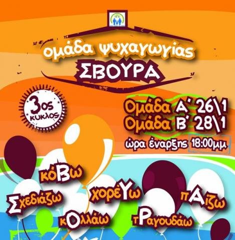 Το Κέντρο Παιδιού και Εφήβου (ΚΠΕ) ενημερώνει ότι στις 26 & 28 Ιανουαρίου ξεκινά τον τρίτο κύκλο συναντήσεων για τη φετινή χρονιά η Ομάδα Ψυχαγωγίας «Σβούρα», η οποία απευθύνεται σε παιδιά ηλικίας 4 έως 10 ετών.