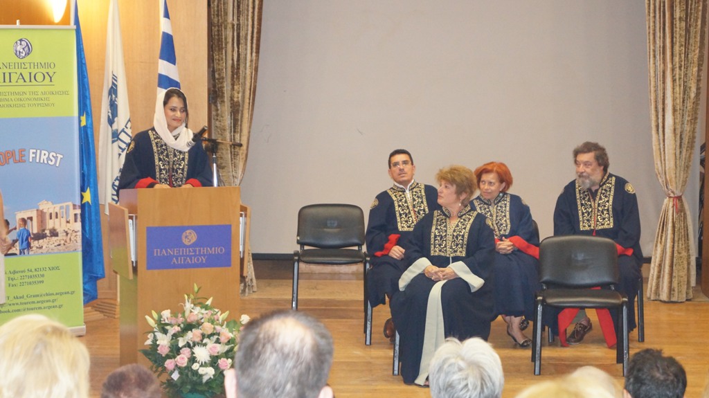 Επίτιμη διδάκτορ του τμήματος Οικονομίας και Διοίκησης Τουρισμού αναγόρευσε το πανεπιστήμιο Αιγαίου την κυρία Αΐσα Μοχάμεντ Σαΐντ Φαντίλα Αλχαμελι, μόνιμη αντιπρόσωπο των Ηνωμένων Αραβικών Εμιράτων στο Διεθνή Οργανισμό Πολιτικής Αεροπορίας, πρώτη γυναίκα πιλότο στα Αραβικά Εμιράτα και υποψήφια για την Προεδρία του Συμβουλίου του ICAO, αναγνωρίζοντας το εξαιρετικό έργο της στο διεθνή αεροπορικό χώρο και στις επιπτώσεις που μπορεί αυτό να έχει στην οικονομική και τουριστική ανάπτυξη.