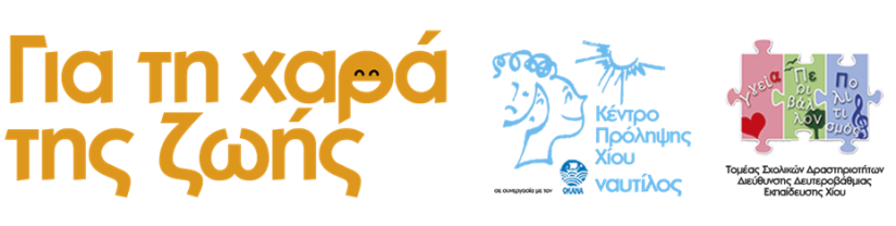 Ένα διήμερο εκδηλώσεων, από τον Τομέα Σχολικών Δραστηριοτήτων και σχολεία της Δευτεροβάθμιας Εκπαίδευσης Χίου καθώς και το Κέντρο Πρόληψης "ναυτίλος", αφιερωμένο στην καλλιτεχνική δημιουργία, την ενημέρωση για την αποφυγή κάθε είδους «συμπληγάδων», το γενναιόδωρο μοίρασμα σκέψεων, αισθημάτων, έργων και χειροτεχνημάτων θα πραγματοποιηθεί στο Αμφιθέατρο τού Πανεπιστημίου Αιγαίου, στη Χίο, την Τρίτη, 7 και την Τετάρτη, 8 Μαίου στις 6.15 μ.μ.