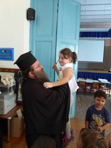 Από την πλευρά τους οι μικροί μαθητές πρόσφεραν στο Σεβασμιώτατο και τον κ. Δήμτσα τα έργα που ζωγράφισαν ειδικά γι αυτή την επίσκεψη.