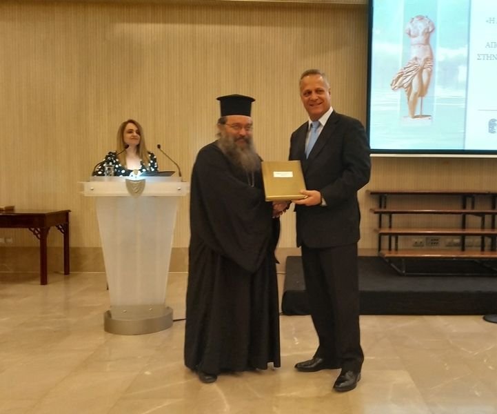 Πρίν ἀπό τήν εἰσήγησή του ὁ Σεβασμιώτατος ἐτιμήθη ἀπό τόν κ. Ὑπουργό Παιδείας τῆς Κυπριακῆς Δημοκρατίας μέ εἰδική πλακέτα.