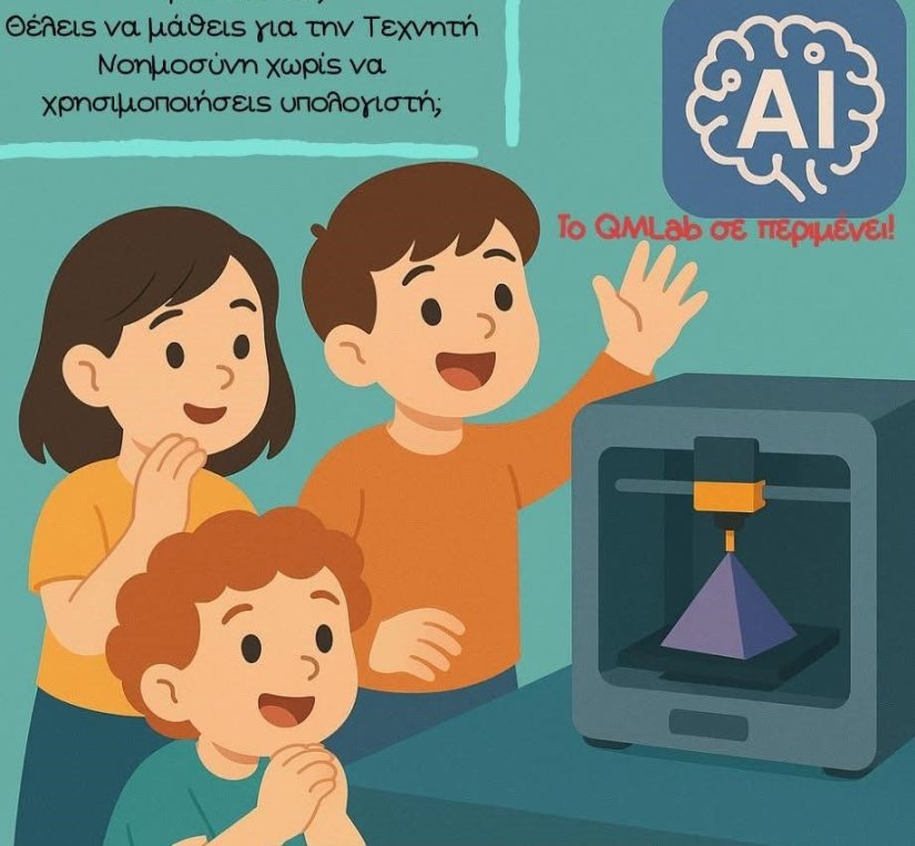 Το Πανεπιστήμιο Αιγαίου και το Εργαστήριο Ποσοτικών Μεθόδων (QMLab) διοργανώνουν την Τρίτη 16 Δεκεμβρίου 2025 ένα πρωτοποριακό βιωματικό εργαστήριο Τεχνητής Νοημοσύνης και Τρισδιάστατης Εκτύπωσης, ειδικά σχεδιασμένο για μαθητές Δ΄, Ε΄ και ΣΤ΄ Δημοτικού.