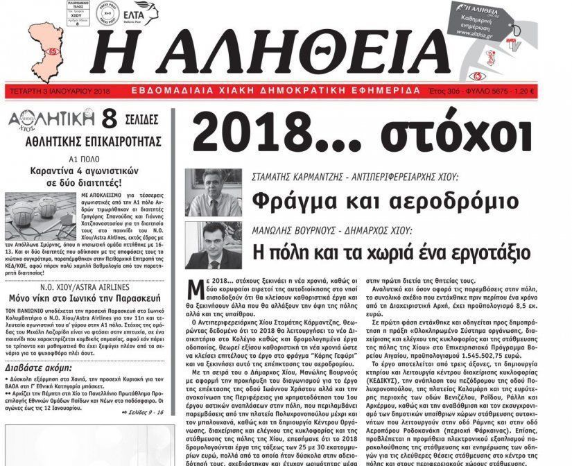 Πολλά, λίγα τόσα γίνεται σήμερα η «ΑΛΗΘΕΙΑ». Τα υποδέχεται με υπερηφάνεια, οπλίζεται με κουράγιο να συνεχίσει στη νέα εποχή, που θέλει το χαρτί να μας αφήνει χρόνους. Επιμένει σ’ αυτό και ταυτόχρονα από σήμερα, τιμώντας τη γιορτή της, συνεχίζει να ανοίγει τα ποιοτικά της πανιά σε μια νέα, ανανεωμένη ηλεκτρονική σελίδα συμβατή και με όλες τις κινητές συσκευές. ΧΡΟΝΙΑ ΠΟΛΛΑ «ΑΛΗΘΕΙΑ» στο www.alithia.gr