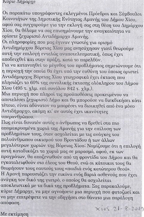 O μη ορισμός Αντιδημάρχου Αμανής βρίσκει αντίθετο το τοπικό συμβούλιο της Βολισσού καθώς και την πλειοψηφία των Προέδρων της ευρύτερης περιοχής. Το alithia.gr δημοσιεύει το έγγραφο που έστειλαν στο νέο Δήμαρχο Χίου, ζητώντας του να επανεξετάσει το θέμα, το οποίο θεωρούν ζωτικής σημασίας για την περιοχής τους.