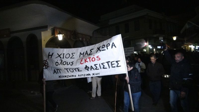 Η πορεία κατευθύνθηκε προς την Αστυνομική Διεύθυνση Χίου, προκειμένου οι διοργανωτές να διαμαρτυρηθούν για τις μη συλλήψεις Χρυσαυγιτών, όπως φώναξαν στα συνθήματα τους, εκτιμώντας ότι η δυνάμεις της Αστυνομίας και τα ΜΑΤ πραγματοποιούν επιλεκτικές συλλήψεις.