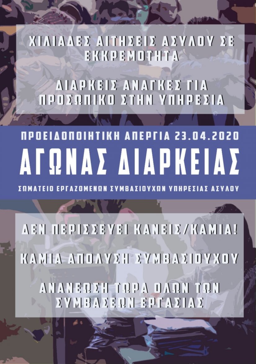 Κατόπιν απόφασης της Γενικής Συνέλευσης των μελών του Σωματείου Εργαζομένων Συμβασιούχων Υπηρεσίας Ασύλου (Σ.Ε.Σ.Υ.Α.), προκηρύσσουμε 24ωρη προειδοποιητική απεργία την Πέμπτη 23 Απριλίου 2020, με συμμετοχή όλων των εργαζομένων συμβασιούχων ορισμένου χρόνου πανελλαδικά. Σε περίπτωση που δεν υπάρξει επίσημη δέσμευση από το Υπουργείο Μετανάστευσης και Ασύλου με δημοσίευση σχετικής ανακοίνωσης περί ανανέωσης/παράτασης όλων ανεξαιρέτως των συμβάσεων εργασίας της ΣΟΧ1/2017, θα προχωρήσουμε σε περαιτέρω απεργιακές κινητοποιήσεις διαρκείας.