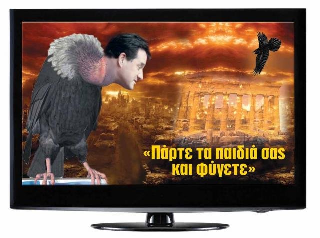 «Ελληνίδες, Έλληνες! Το καλό που σας θέλω! Πάρτε τα λεφτά σας, πάρτε τα κοσμήματά σας, πάρτε τα ρούχα σας, πάρτε τα εσώρουχά σας, πάρτε τα παπούτσια σας, πάρτε το φαγητό σας, πάρτε το ποτό σας! Πάρτε τις γυναίκες σας, πάρτε τους άνδρες σας, πάρτε τις γκόμενές σας, πάρτε τα παιδιά σας, πάρτε τα σκυλιά σας, πάρτε τους κουμπάρους σας, πάρτε τις κουμπάρες σας, πάρτε τους γονείς σας, τα εγγόνια σας, τα αδέλφια σας, τα ξαδέλφια σας, τους μπατζανάκηδές σας, τις συννυφάδες σας, τους γαμπρούς σας, τις νύφες σας, πάρτε τέλος πάντων ό,τι έχετε και δεν έχετε και βγάλτε το έξω, κατά προτίμηση στην Ελβετία! Ο καιρός γαρ εγγύς! Έρχονται οι συριζαίοι και –ακόμα χειρότερο– έρχονται οι πασοκοσυριζαίοι! Που φωτιά να τους κάψει! Οι εφτά πληγές του Φαραώ να πέσουν στα κεφάλια τους! Σας κάνω μια τελευταία προειδοποίηση: Αν γίνει πρωθυπουργός ο Αλέξης Τσίπρας –αν, λέμε, αν γίνει–, θα πέσουν ακρίδες, θα πέσουν επιδημίες –τύφος, χολέρα, πανούκλα, τεταρταίος πυρετός–, ο δε Έμπολα θα είναι ιός-αγγελούδι μπροστά σε όσα θα πέσουν στο κεφάλι μας! Θα πέσει πείνα, θα πέσει δίψα, θα πέσουν κεφάλια, θα πέσουν σκεπές, θα πέσουν χιόνια. Οι θάλασσες θα φουσκώσουν, οι ουρανοί θα ανοίξουν, τα ποτάμια θα ξεχειλίσουν, οι τυφώνες δεν θα αφήσουν τίποτα όρθιο! Τα σπίρτα δεν θα ανάβουν και θα έχουμε μια διαρκή φαγούρα, πόνους στη μέση, ναυτία και εμετούς! Θα επιστρέψουμε στον κόσμο των σπηλαίων και στην εποχή των παγετώνων, ενώ καλά δεν είμαστε σήμερα που ζούμε την εποχή του ευλογημένου μνημονίου, το οποίο προκάλεσε μόνο 4.000 αυτοκτονίες, με αποτέλεσμα να έχουμε, τελικά, συντριπτική πλειοψηφία ζώντων;».