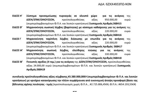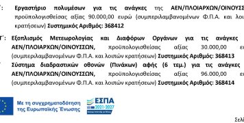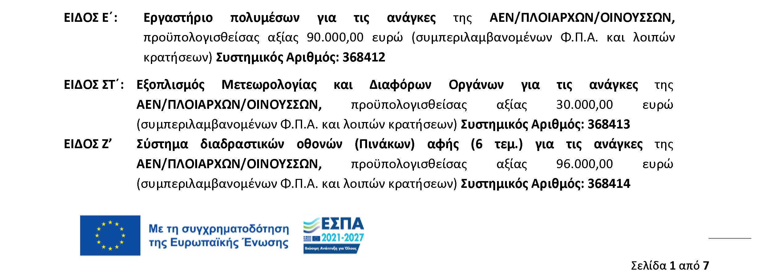 Ο διαγωνισμός αφορά τον εξειδικευμένο εξοπλισμό για τις ανάγκες της εκπαίδευσης των ναυτικών όπως προσομοιωτή πυρόσβεσης, σωστικές λέμβους με σύστημα καθαίρεσης κ.α. Στον ίδιο διαγωνισμό περιλαμβάνεται ακόμη σημαντικός εξοπλισμός όπως μετεωρολογικός σταθμός, πολυμέσα κ.α. για την ΑΕΝ Πλοιάρχων Οινουσσών.