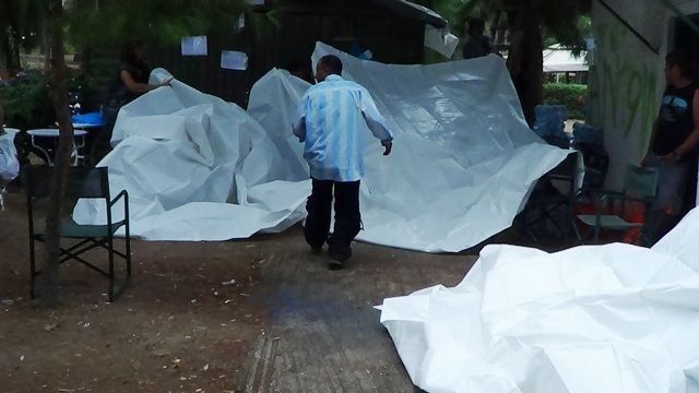 Πού κατέφυγαν σήμερα οι πρόσφυγες στον Δημοτικό Κήπο, την ώρα της βροχής; Στις σκηνές του ΟΗΕ και όπου υπήρχε τριγύρω υπόστεγο, μέχρι βέβαια να προλάβουμε τη λύση ΒΙΑΛ -που υπ’ όψιν την παλεύει ο Δήμαρχος Χίου ένα χρόνο- πριν μαζί με τη βροχή προκύψει και το κρύο. Σήμερα πάντως οι εθελοντές προσπαθούσαν να φτιάξουν πρόχειρα έστω υπόστεγα ενώ η έκκληση που γίνεται δεν αφορά πια ρούχα αλλά αδιάβροχα και μη μας φανεί παράξενο τσάντες πλάτης, κάνουν και οι παλιές σχολικές τσάντες, για να μπορούν να μεταφέρουν τα στοιχειώδη, που φέρουν μαζί τους για τη συνέχεια του ταξιδιού.