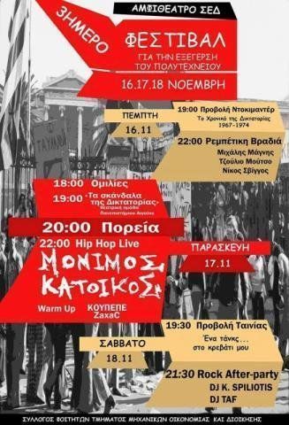 Την Παρασκευή 17/11 στις 6.00 μ.μ. θα πραγματοποιηθούν ομιλίες από τον Σύλλογο Φοιτητών του ΤΜΟΔ, από εκπρόσωπο του Εργατικού Κέντρου και από άλλους φορείς. Μετά το τέλος των ομιλιών, στις 7:00 μ.μ. η Θεατρική Ομάδα του Πανεπιστημίου Αιγαίου θα παρουσιάσει ένα σκετς με τίτλο «Τα Σκάνδαλα της Δικτατορίας». Το τέλος του θεατρικού σκετς θα σημάνει την έναρξη της Πορείας, η οποία θα ξεκινήσει περίπου στις 8.00 μ.μ.. Στις 10:00 μ.μ. στο Hip Hop Live που θα ακολουθήσει θα τραγουδήσουν ο Μόνιμος Κάτοικος, ο Κουπεπε και ο ZaxaC.