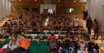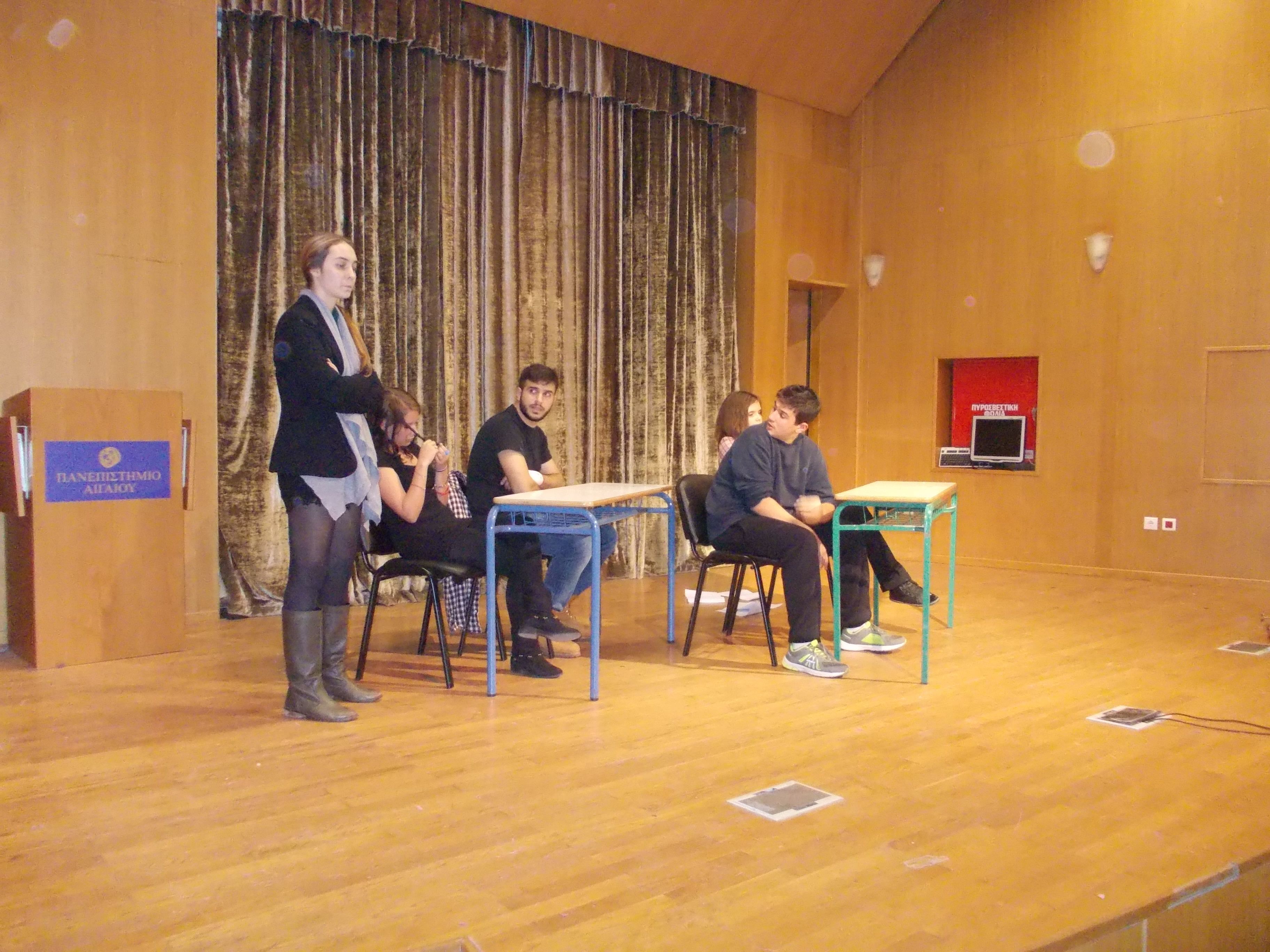 Το Αμφιθέατρο του Πανεπιστήμιου Αιγαίου, συγκέντρωσε αρκετό κόσμο, κάθε ηλικίας, με το θεατρικό και μουσικό μέρος της εκδήλωσης να θυμίζει και να μεταφέρει το μήνυμα του Νοέμβρη του 74.
