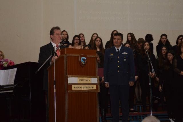 Μέσα σε ένα υπερπλήρες αμφιθέατρο από νεοσύλλεκτους, παρουσία των αρχών του τόπου, εκπροσώπων φορέων, ενώπιον του διοικητή της Πτέρυγας, σμήναρχου Ανδρέα Μανωλάκη, των επιτελών του και με τιμητική έλευση του διοικητή της Διοίκησης Αεροπορικής Εκπαίδευσης πτεράρχου Θωμά Χατζηαθανασίου, ο επισμηναγός Δημήτριος Νικήτας παρουσίασε ένα ιστορικό χρονικό της Πολεμικής Αεροπορίας από το 1912, όταν πραγματοποιήθηκε στην Ελλάδα η πρώτη πτήση από τον αεροπόρο Εμμανουήλ Αργυρόπουλο -με τη δεύτερη πτήση να την κάνει έχοντας συνεπιβάτη τον Πρωθυπουργό Ελευθέριο Βενιζέλο- μέχρι τα σημερινά F16 που δρουν στο Αιγαίο. Ο σμήναρχος εν αποστρατεία Δημήτριος Φωτόπουλος αναφέρθηκε στο ρόλο των εφέδρων στους πολέμους, ενώ ακολούθως η μαθητική χορωδία ερμήνευσε αποσπάσματα από το Άξιον Εστί του Οδυσσέα Ελύτη σε μουσική Μίκη Θεοδωράκη και τον αφηγητή να προειδοποιεί: « Ήρθαν ντυμένοι φίλοι / αμέτρητες φορές οι εχθροί μου/ τα παμπάλαια δώρα προσφέροντας…».