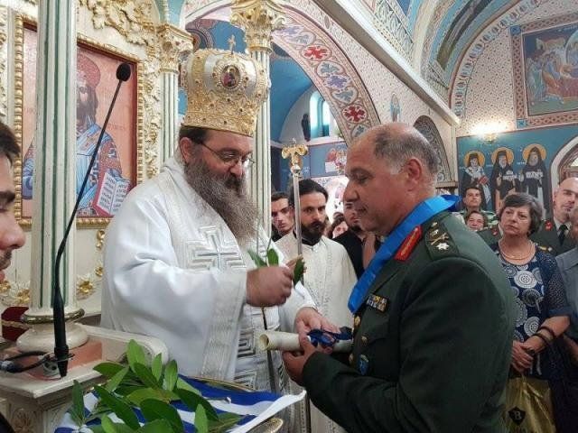Στο τέλος της Θείας Λειτουργίας ο Σεβασμιώτατος τίμησε με την ανώτατη διάκριση της Χιακής Εκκλησίας, το Σταυρό του Πολιούχου της Χίου Αγίου Ισιδώρου, το Στρατιωτικό Διοικητή της 96 ΑΔΤΕ κ. Δημόκριτο Κωνσταντάκο, με καταγωγή από την ηρωική Μάνη.