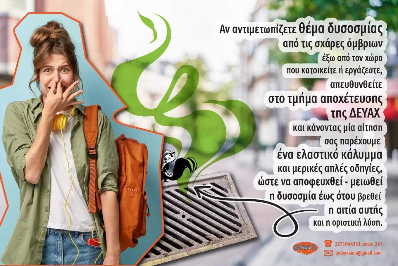 Την ίδια στιγμή όμως, δείγμα του πώς αντιμετωπίζει η δημοτική αρχή ΝΔ-ΣΥΡΙΖΑ, τόσο σοβαρά και κεφαλαιώδη ζητήματα, είναι η αφίσα που κυκλοφόρησε η ΔΕΥΑΧ, με αφορμή την ενδεχόμενη δυσοσμία από κάποιες αποχετεύσεις συμπολιτών μας , που τους καλεί να κάνουν αίτηση στην υπηρεσία , για να τους παρασχεθεί κάποιο ελαστικό κάλυμμα, που θα τοποθετήσουν οι ίδιοι προφανώς, μέχρι να βρεθεί η οριστική λύση κι ας πληρώνουν την αποχέτευση κι ας πληρώνουν και το χαράτσι του τέλους ετοιμότητας .
