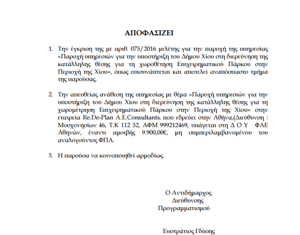 ΔΕΚΑ ΨΩΡΟΧΙΛΙΑΡΙΚΑΚΙΑ ΑΚΟΜΑ(11.500 ΜΕ ΤΟ ΦΠΑ) ΑΠΕΥΘΕΙΑΣ ΑΝΑΘΕΣΗ ΑΠΟ ΤΟΝ ΑΝΤΙΔΗΜΑΡΧΟ ΕΥΣΤΡΑΤΙΟ ΓΔΥΣΗ ΚΑΙ ΠΑΛΙ ΣΕ ΑΘΗΝΑΙΚΗ ΕΤΑΙΡΕΙΑ ΓΙΑ ΤΗΝ ΕΥΡΕΣΗ ΚΑΤΑΛΛΗΛΟΥ ΧΩΡΟΥ ΓΙΑ ΕΠΙΧΕΙΡΗΜΑΤΙΚΟ ΠΑΡΚΟ ΣΤΗΝ ΧΙΟ. ΠΕΡΙΜΕΝΕ ΕΣΥ ΜΑΛΕΑ ΧΙΩΤΗ ΜΗΧΑΝΙΚΕ ΚΑΙ ΕΠΑΓΓΕΛΜΑΤΙΑ ΥΠΟΣΤΗΡΙΞΗ ΑΠΟ ΤΟ ΔΗΜΑΡΧΟ ΜΑΝΩΛΗ ΒΟΥΡΝΟΥ ΤΩΡΑ ΣΤΑ ΔΥΣΚΟΛΑ.