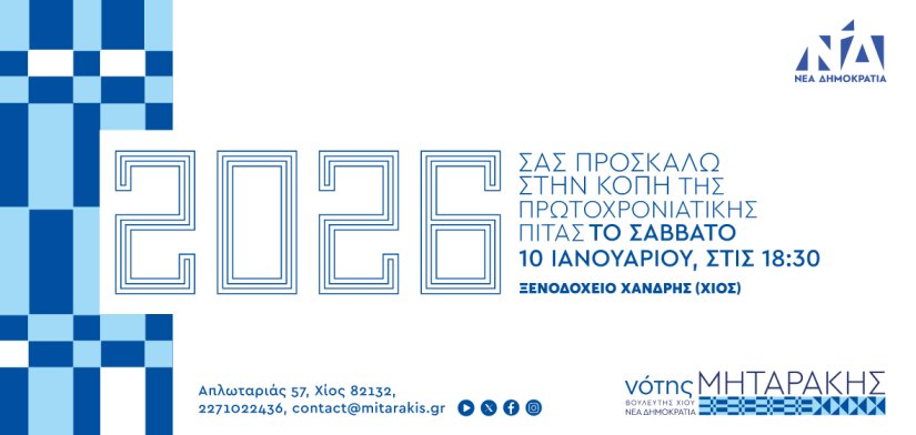 Το Σάββατο 10 Ιανουαρίου θα πραγματοποιηθεί η Κοπή της Πρωτοχρονιάτικης Πίτας του Νότη Μηταράκη στη Χίο.