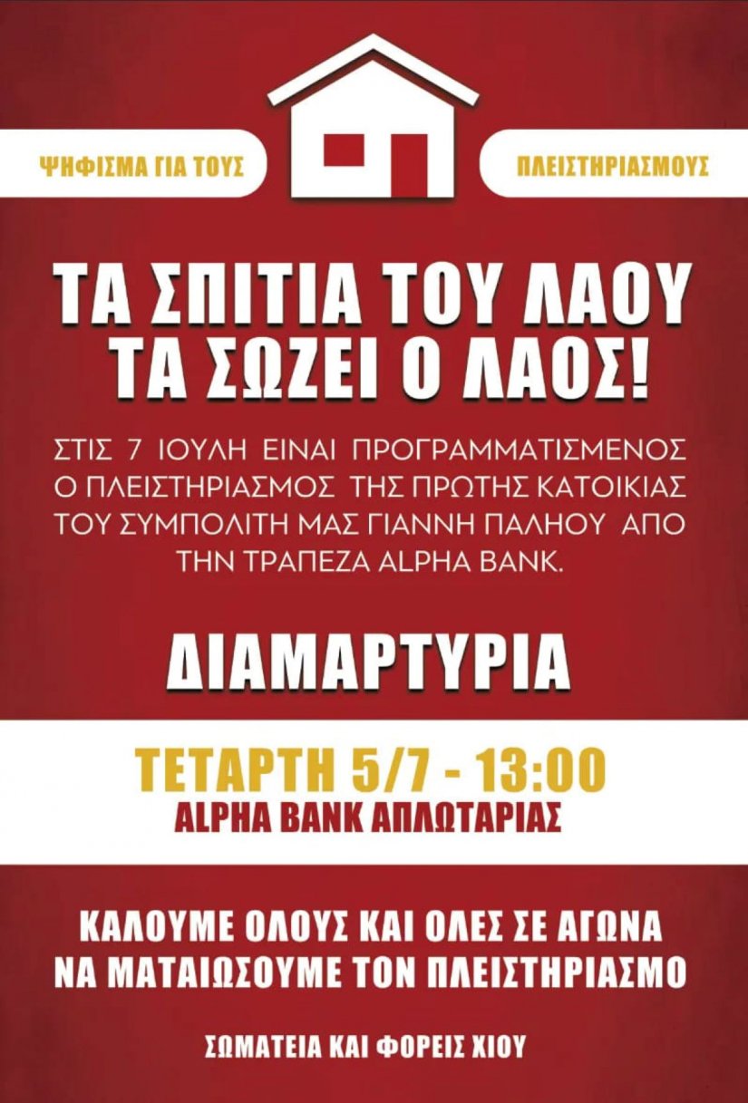 Αγαπητές φίλες και φίλοι, σας καλώ την Τετάρτη 5 Ιουλίου στη μία το μεσημέρι έξω από την alfa bank Απλωταριάς στη διαμαρτυρία κατά του προγραμματισμένου πλειστηριασμού του μοναδικού σπιτιού μου με το αίτημα να σταματήσουν όλοι οι προγραμματισμένοι πλειστηριασμοί, αλλά και γενικότερα να μπει φρένο στη λεηλασία της λαϊκής κατοικίας. Δεν είμαστε ούτε στρατηγικοί κακοπληρωτές ούτε μπαταχτσήδες. Είμαστε βιοπαλαιστές που δεν μπορούν να ανταποκριθούν στις ληστρικές απαιτήσεις των τραπεζών. Μόνο με την οργάνωση και πάλη μέσα στα σωματεία και τους φορείς του λαϊκού κινήματος, όσοι από εμάς κινδυνεύουμε να χάσουμε το σπίτι μας μπορούμε να σταματήσουμε την αδηφαγία των τραπεζών και των κυβερνήσεων. Μόνο το οργανωμένο λαϊκό κίνημα μπορεί να μπει εμπόδιο στα μέτρα που παίρνονται σε βάρος μας, βάζοντας μπροστά τις δικές μας ανάγκες. Η αλληλεγγύη που θα δείξουν στις γειτονιές μπορεί να αλλάξει την κατάσταση, μπορεί να σώσει τα σπίτια μας. Το δείξαμε στο παρελθόν, όποτε χρειάστηκε, θα το κάνουμε και τώρα. Μόνο ο λαός μπορεί να σώσει τον λαό!"